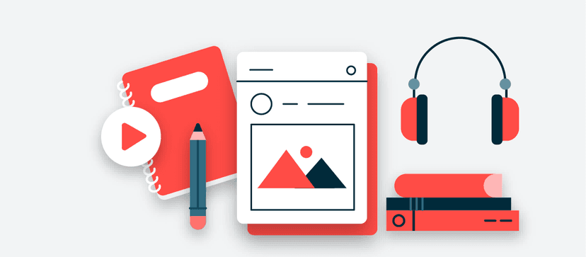 Illustration of multimedia content elements including notebook, pencil, digital screen with mountain image, headphones, and books in coral and navy